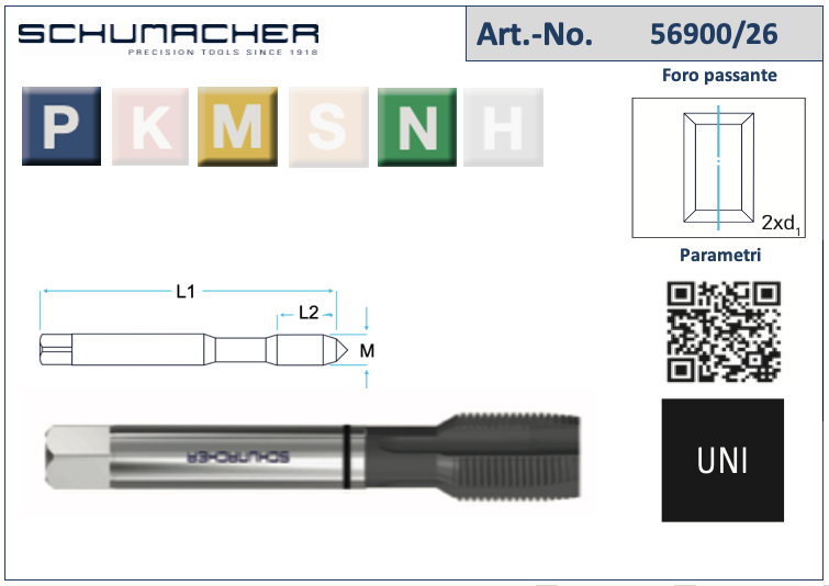 | Codice | Descrizione | Diametro Lavoro Maschio (DLM) | Tipo Maschio | Rivestimento | Lunghezza Utile (l) | Lunghezza (L) | Imbocco | Disp. | |||||||||||||||