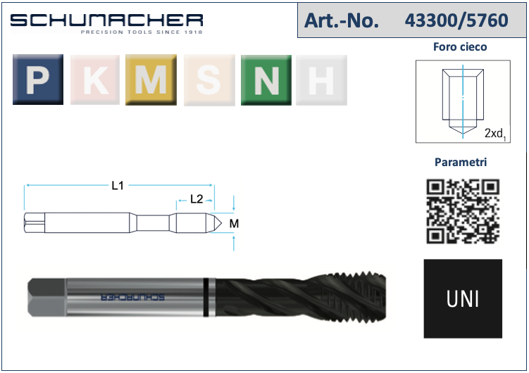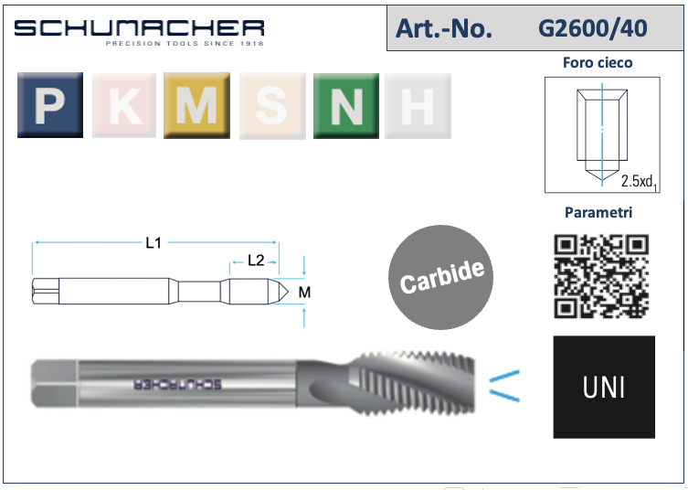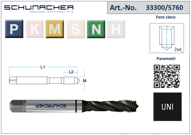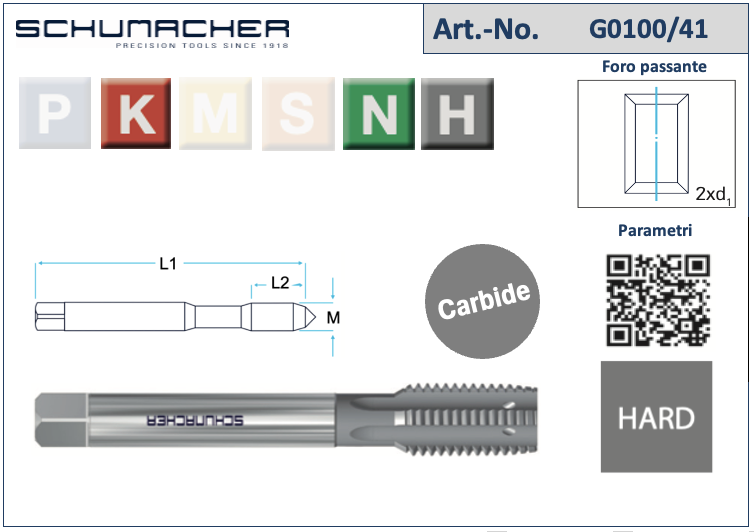 | Codice | Descrizione | M-Diametro Maschio | Tipo Maschio | Diametro Lavoro Maschio (DLM) | Tolleranza | Lunghezza (L2) | Rivestimento | Imbocco | Lunghezza Utile (l) | Lunghezza (L) | L1 | Disp. | |||||||||||