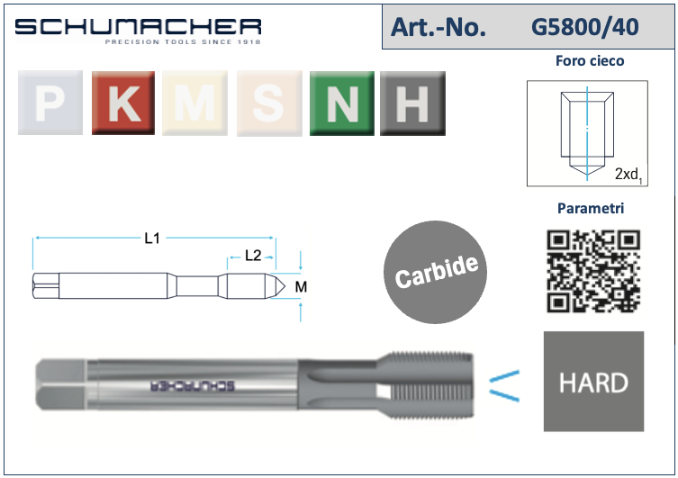 | Codice | Descrizione | M-Diametro Maschio | Tipo Maschio | Diametro Lavoro Maschio (DLM) | Tolleranza | Lunghezza (L2) | Rivestimento | Imbocco | Lunghezza Utile (l) | Lunghezza (L) | L1 | Disp. | |||||||||||