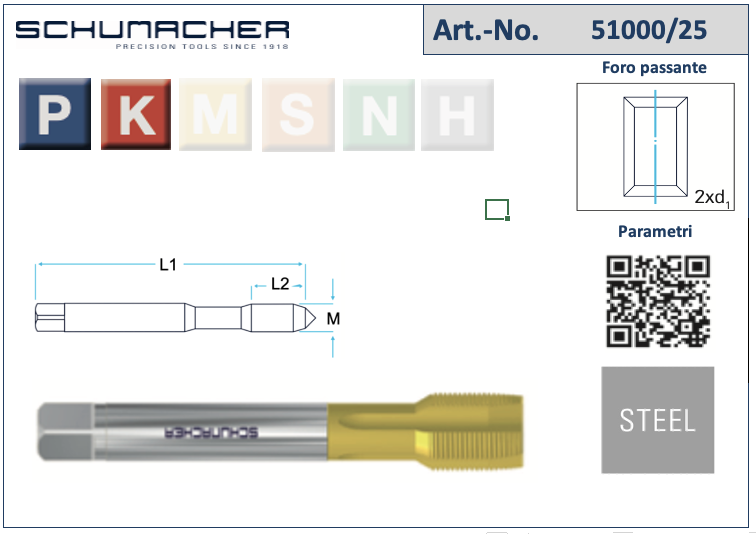 | 55230270 | MF12X1.25-6H-0° (51200/25) FP INOX-IMB.B MASCHIO TIN BLU RING | MF12x1.25 | Foro Passante | Tin | 6H | B | 22 | 100 | |||||||||||||||