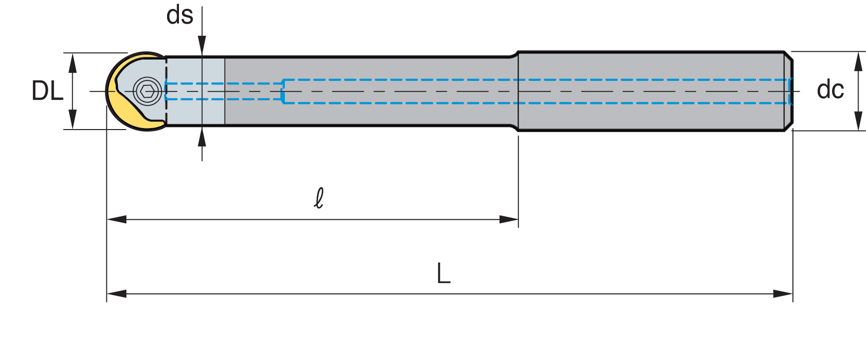 | Codice | Descrizione | Diametro Lavoro (DL) | Numero Taglienti (Z) | Lunghezza Utile (l) | Diametro Attacco (dc) | Diametro scarico (ds) | Attacco Filettato (M) | Lunghezza (L) | Profondita' di Passata (ap) | Centraggio (C) | F/L | Disp. | |||||||||||