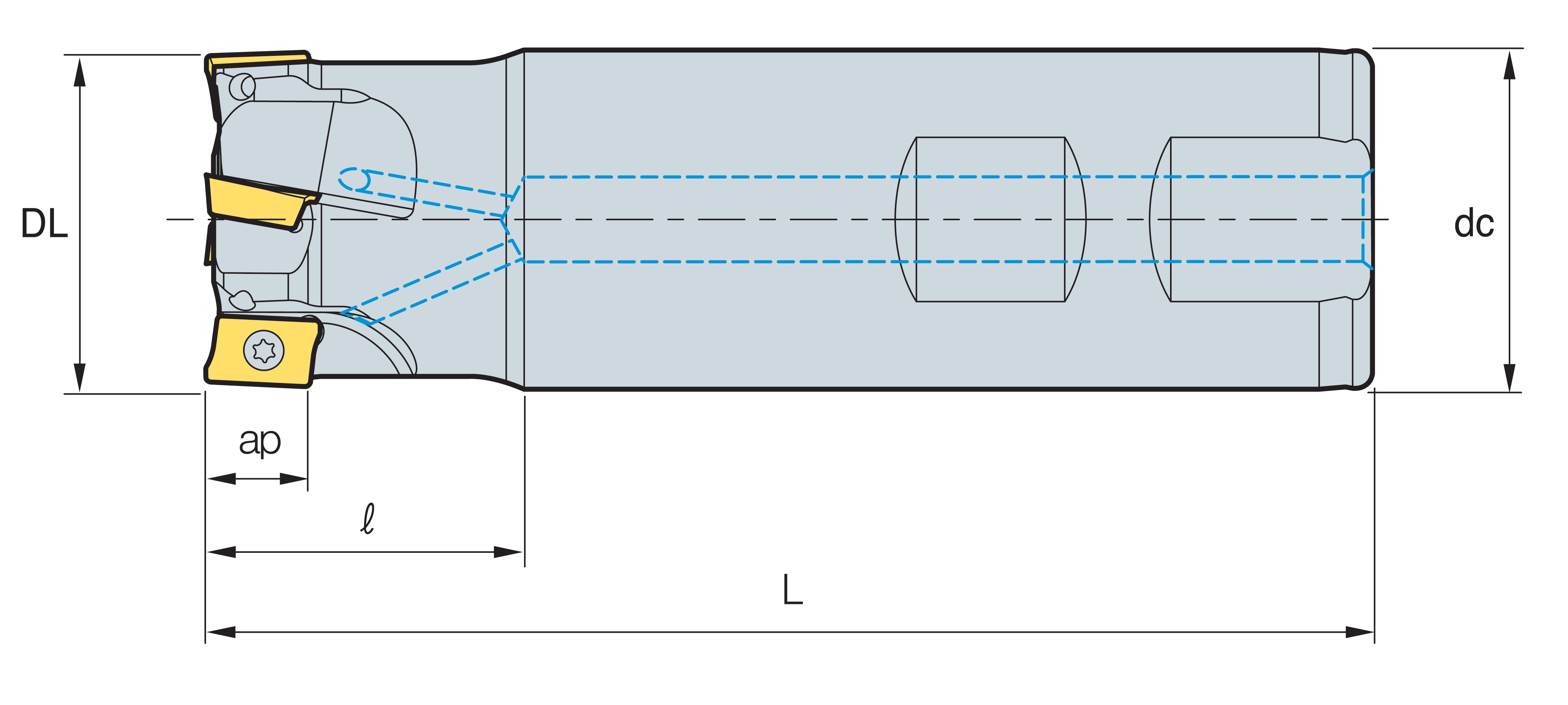 | Codice | Descrizione | Diametro Lavoro (DL) | Numero Taglienti (Z) | Diametro Attacco (dc) | Diametro Attacco a Manicotto (dm) | Attacco Filettato (M) | Lunghezza (L) | Lunghezza Utile (l) | Profondita' di Passata (ap) | Altezza (H) | Centraggio (C) | Disp. | |||||||||||