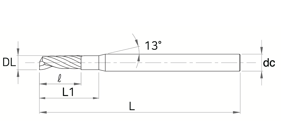 | Codice | Descrizione | Diametro Lavoro (DL) | Numero Taglienti (Z) | Diametro Attacco (dc) | HRc | Lunghezza Utile (l) | Lunghezza (L) | Lunghezza (L1) | Disp. | ||||||||||||||