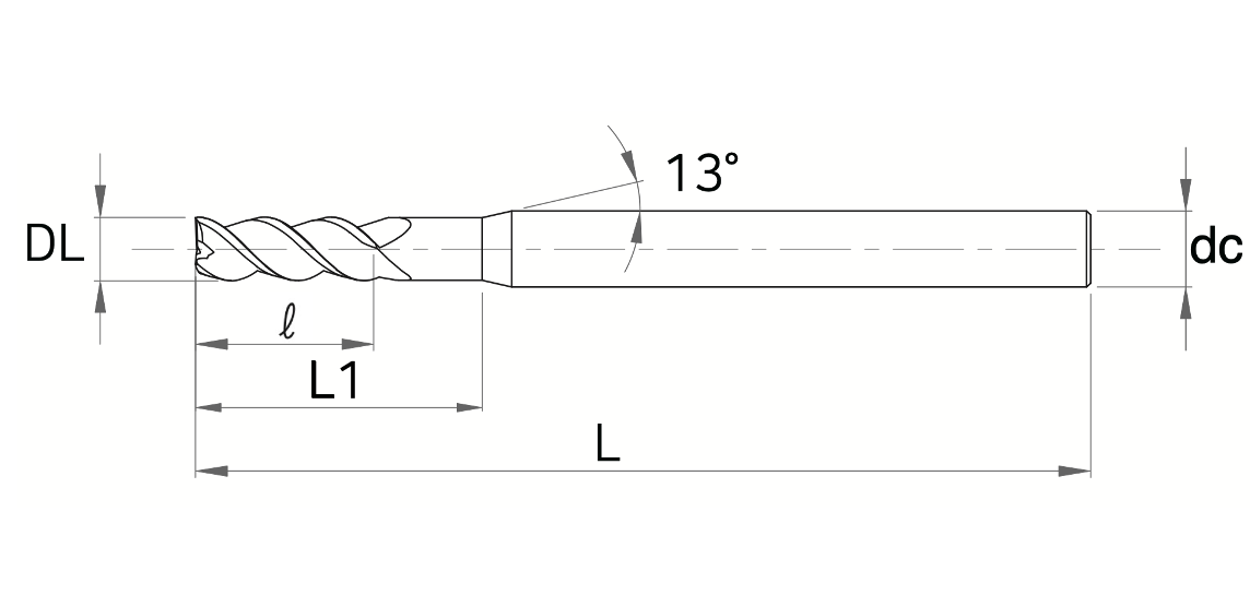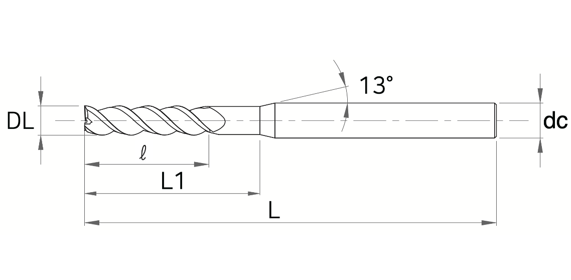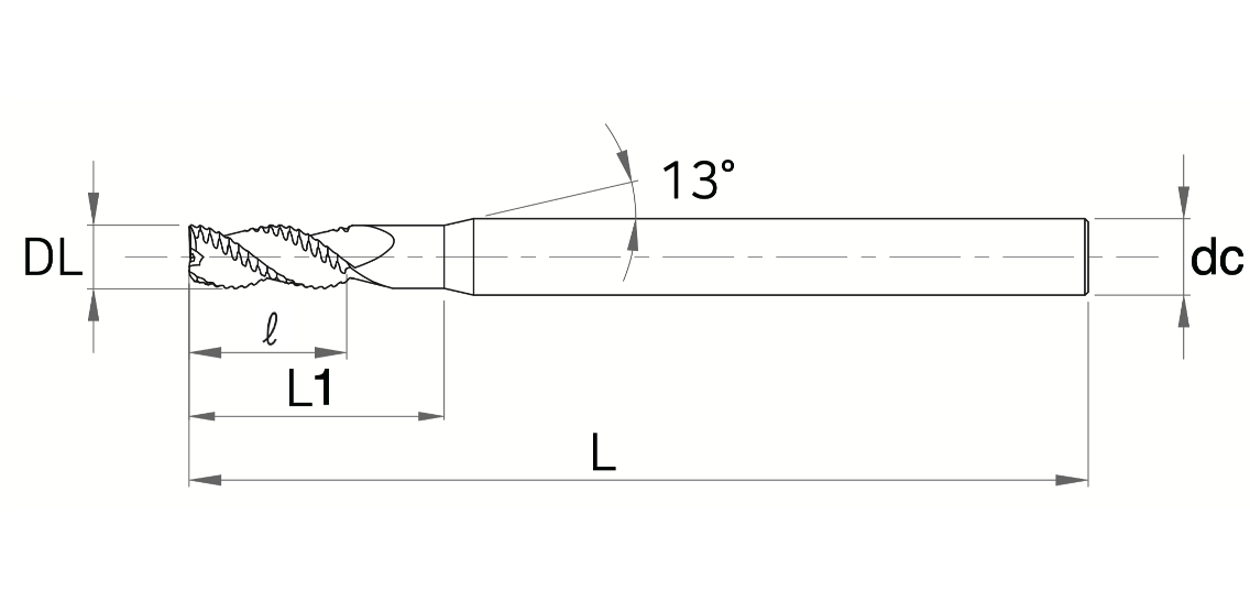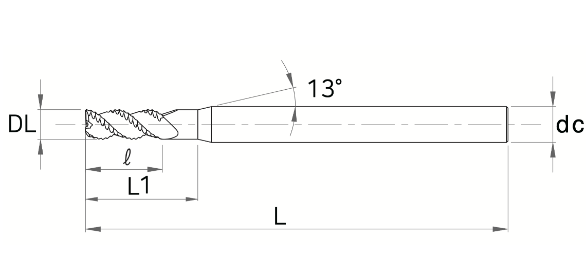 | Codice | Descrizione | Diametro Lavoro (DL) | Numero Taglienti (Z) | Diametro Attacco (dc) | HRc | Lunghezza Utile (l) | Lunghezza (L) | Lunghezza (L1) | Disp. | ||||||||||||||