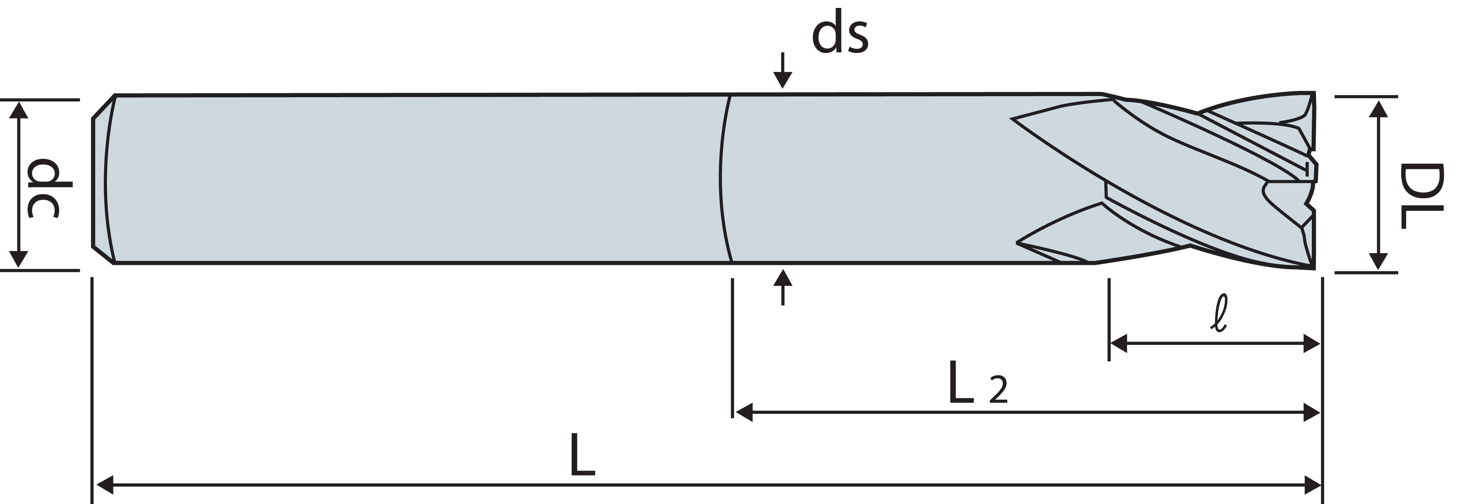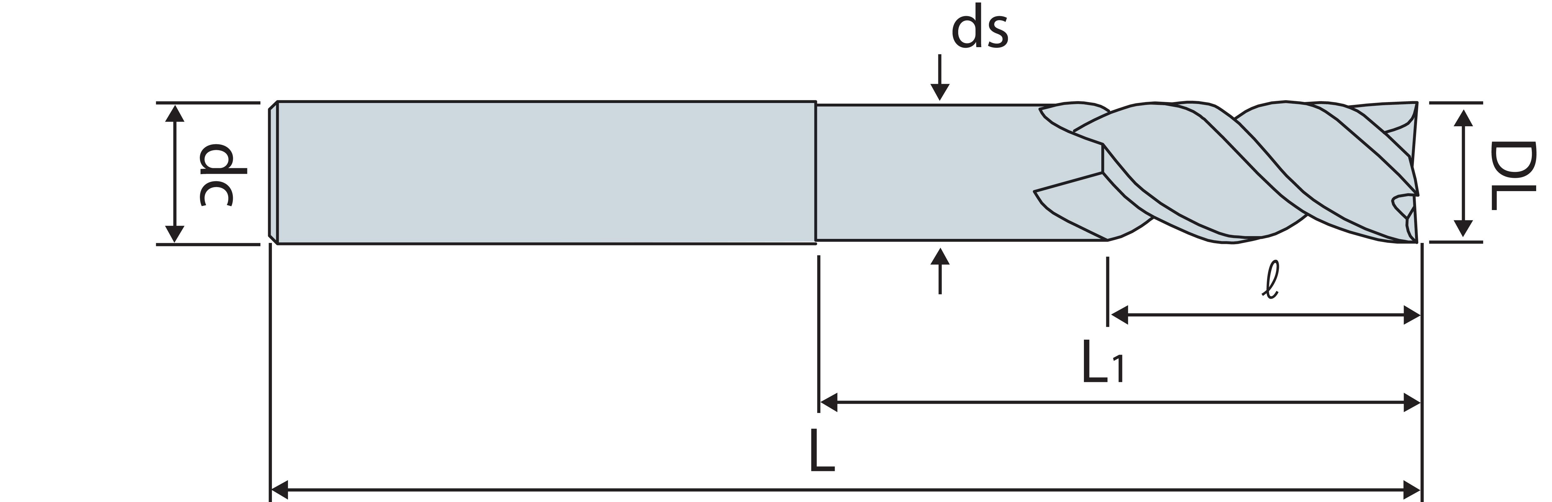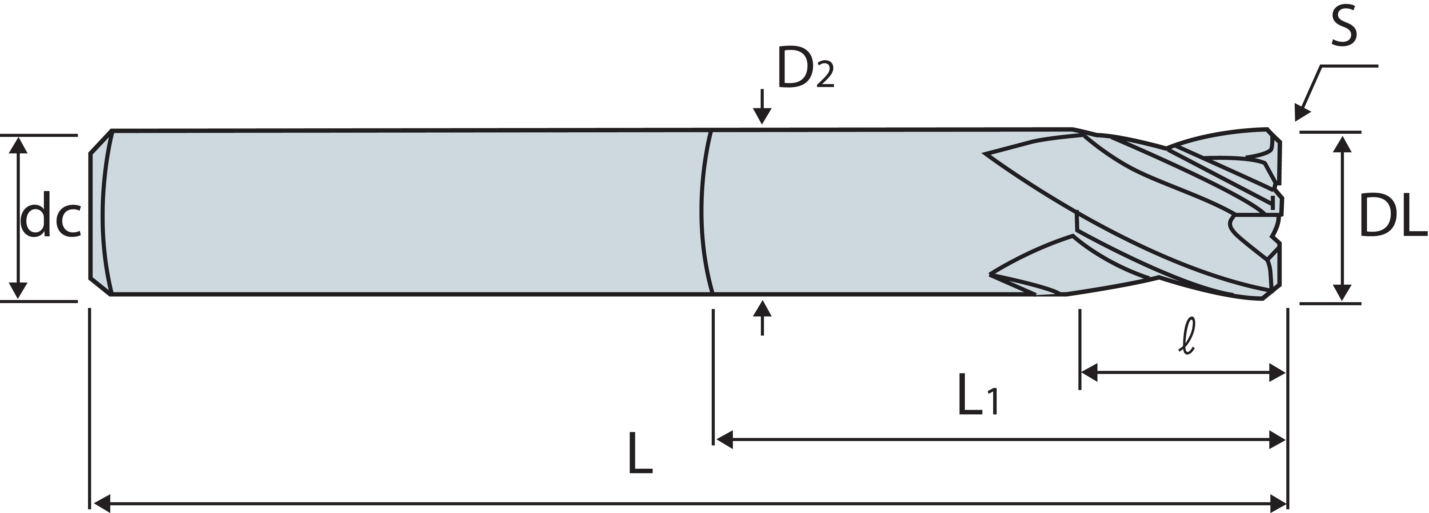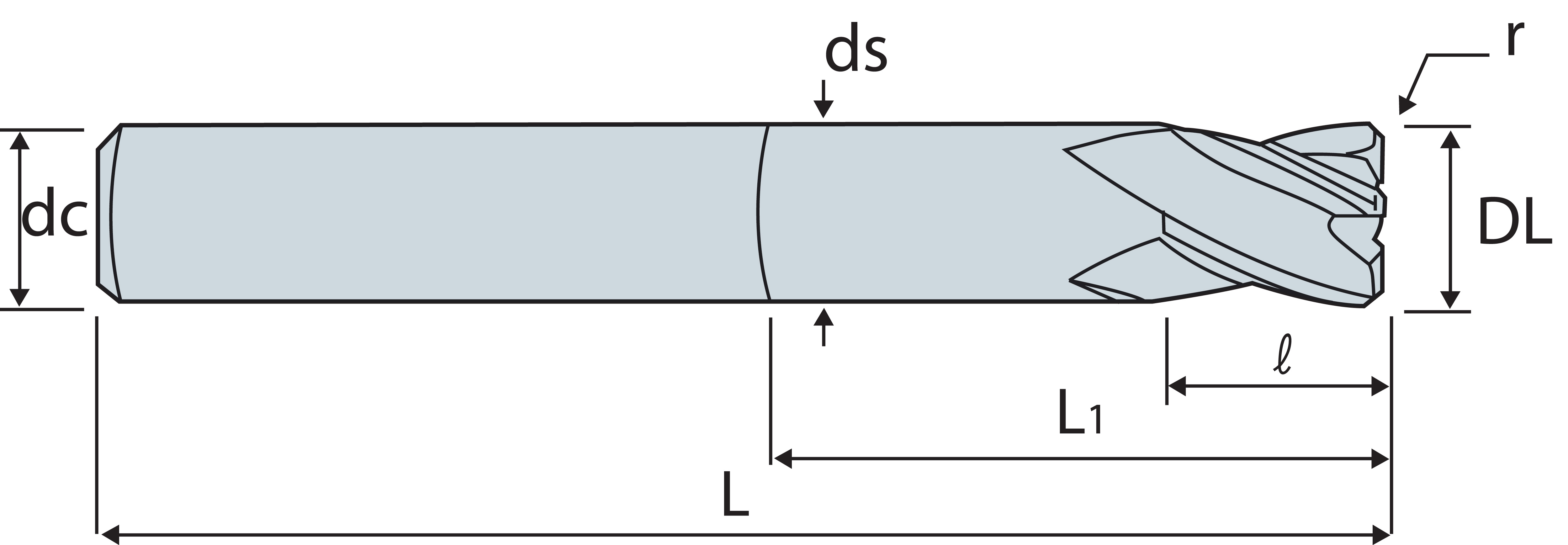 | Codice | Descrizione | Diametro Lavoro (DL) | Numero Taglienti (Z) | Diametro Attacco (dc) | HRc | Lunghezza Utile (l) | Lunghezza (L) | Disp. | |||||||||||||||
