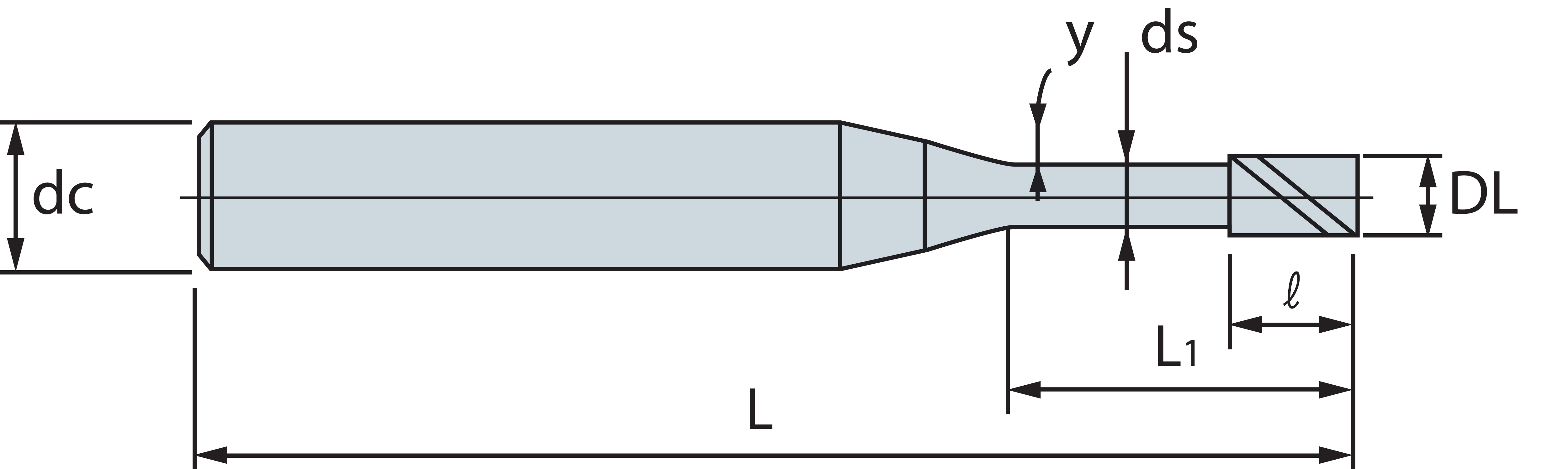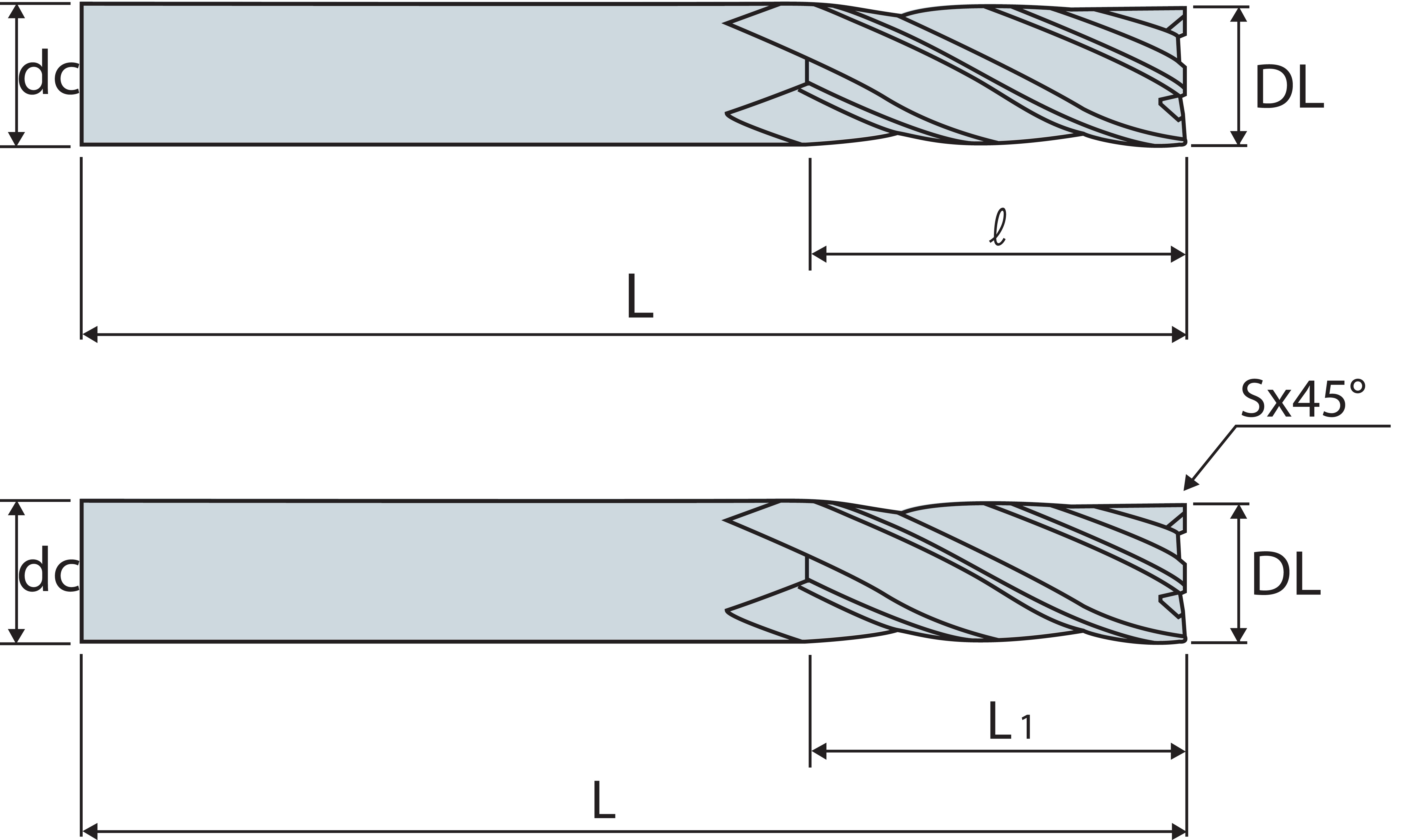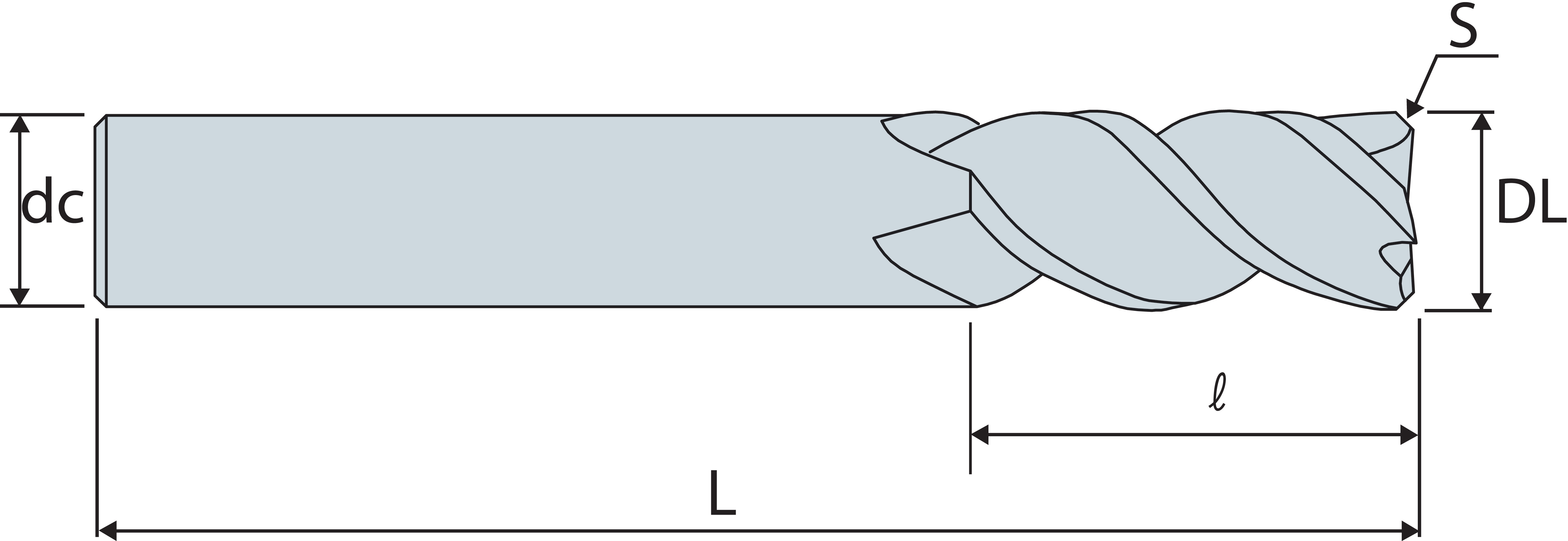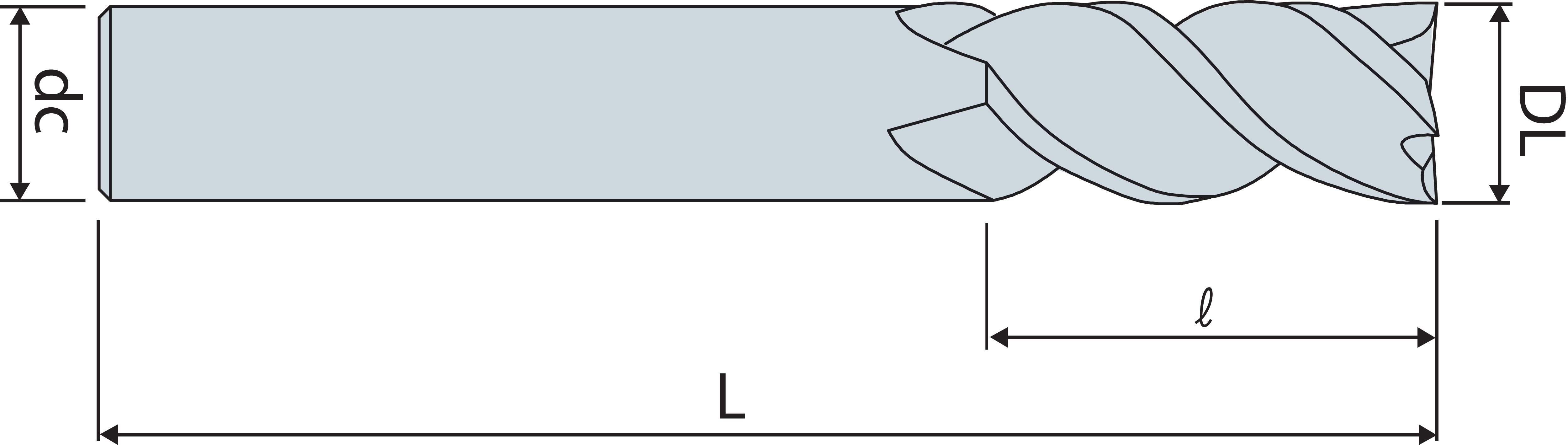 | Codice | Descrizione | Diametro Lavoro (DL) | Numero Taglienti (Z) | Diametro Attacco (dc) | HRc | Lunghezza Utile (l) | Lunghezza (L) | Disp. | |||||||||||||||