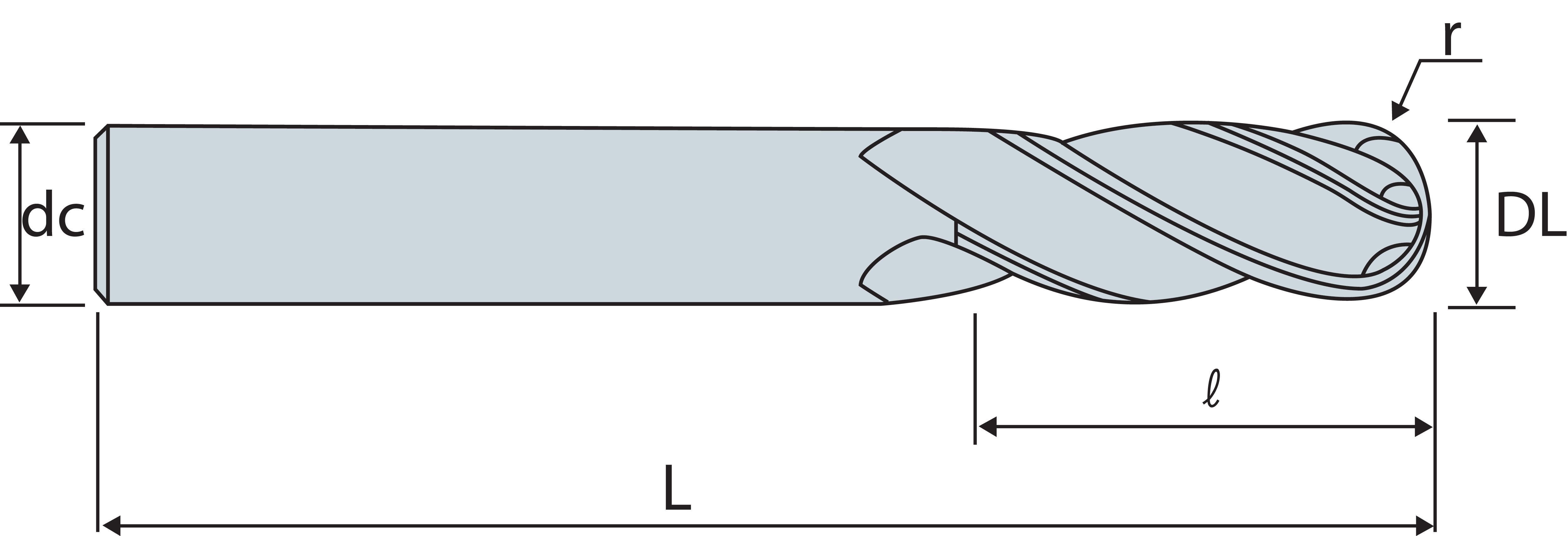 | Codice | Descrizione | Diametro Lavoro (DL) | Numero Taglienti (Z) | Diametro Attacco (dc) | HRc | Lunghezza Utile (l) | Lunghezza (L) | Lunghezza (L1) | Raggio | Disp. | |||||||||||||