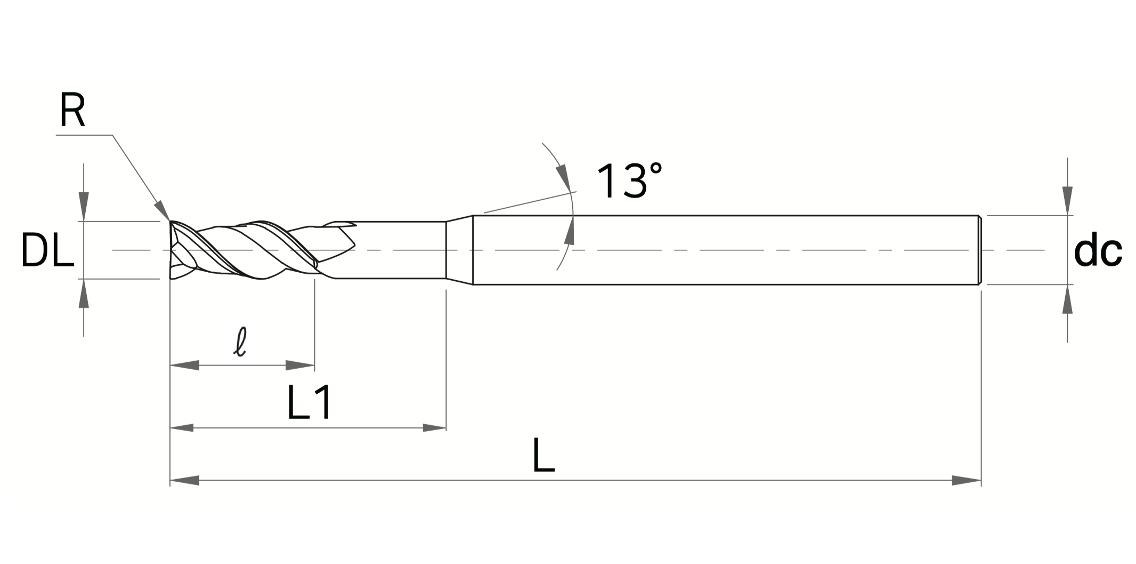 | Codice | Descrizione | Diametro Lavoro (DL) | Numero Taglienti (Z) | Diametro Attacco (dc) | HRc | Lunghezza Utile (l) | Lunghezza (L) | Lunghezza (L1) | Raggio | Disp. | |||||||||||||