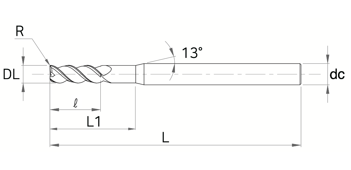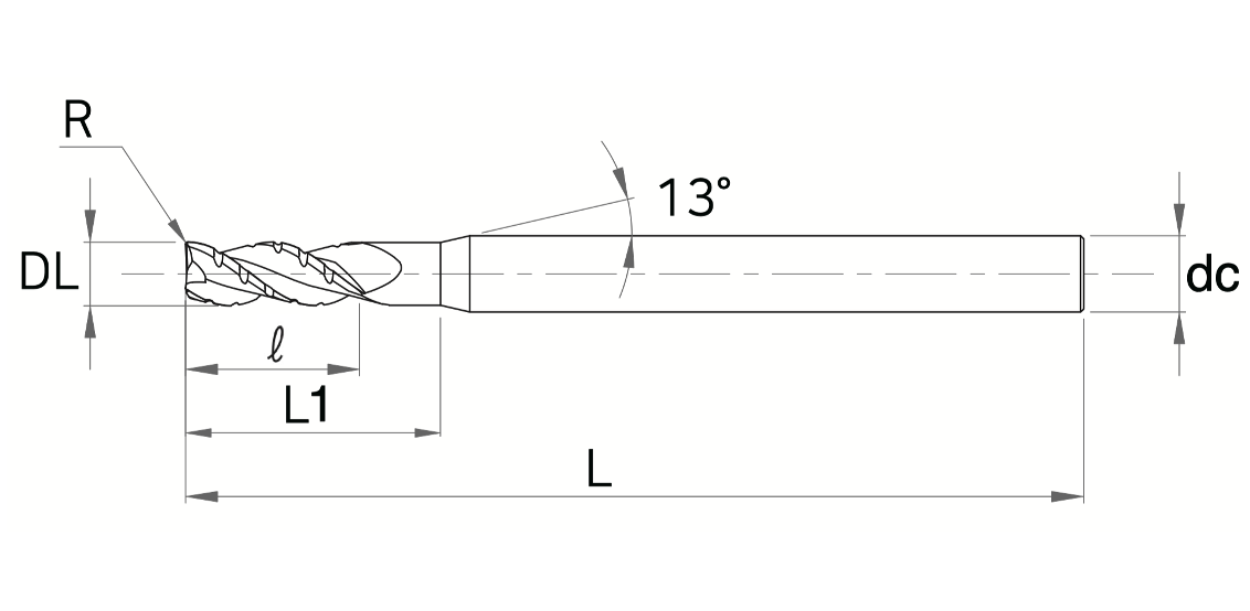 | Codice | Descrizione | Diametro Lavoro (DL) | Numero Taglienti (Z) | Diametro Attacco (dc) | HRc | Lunghezza Utile (l) | Lunghezza (L) | Lunghezza (L1) | Raggio | Disp. | |||||||||||||