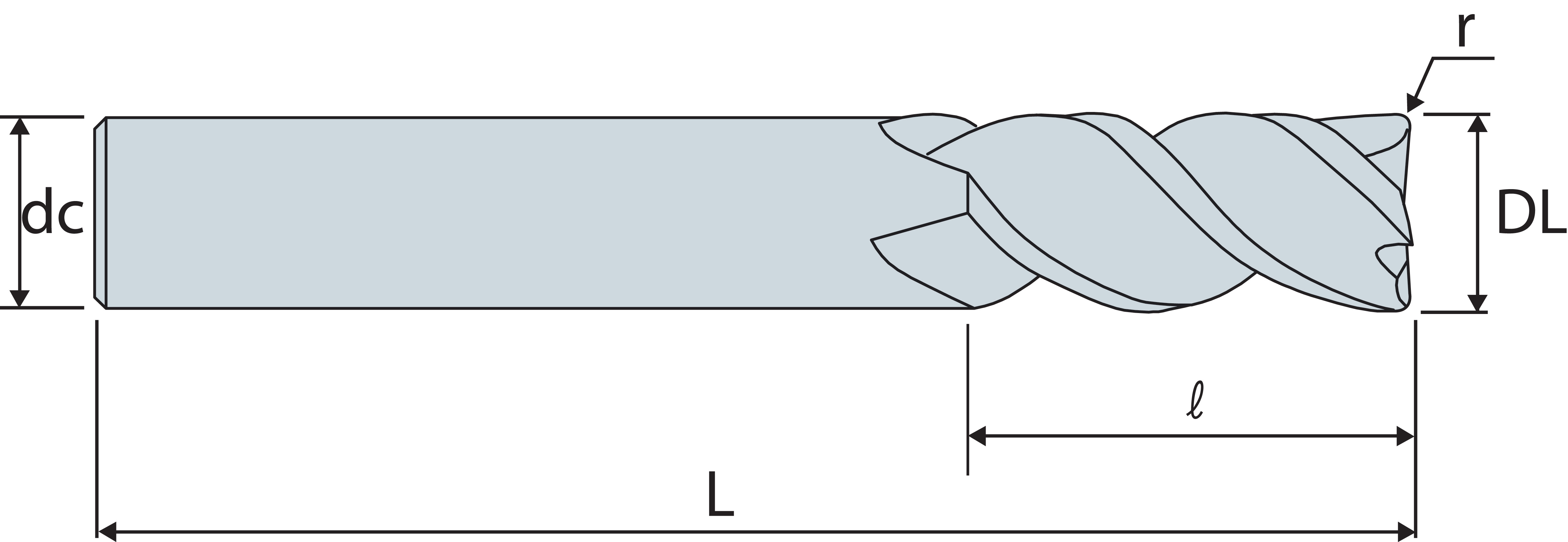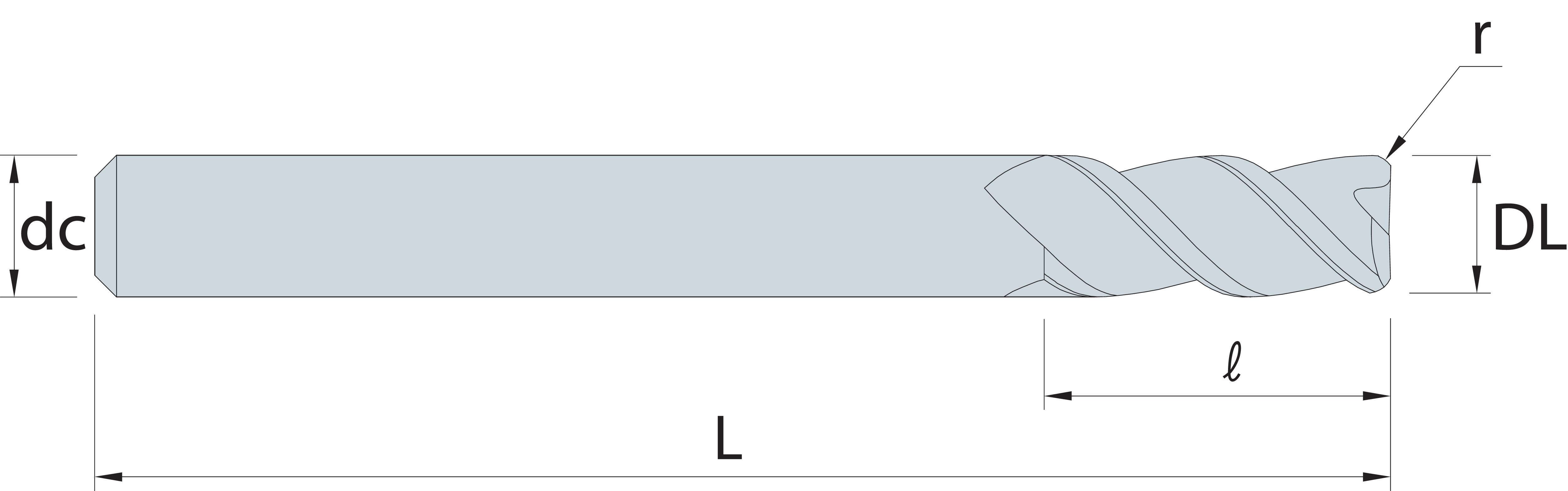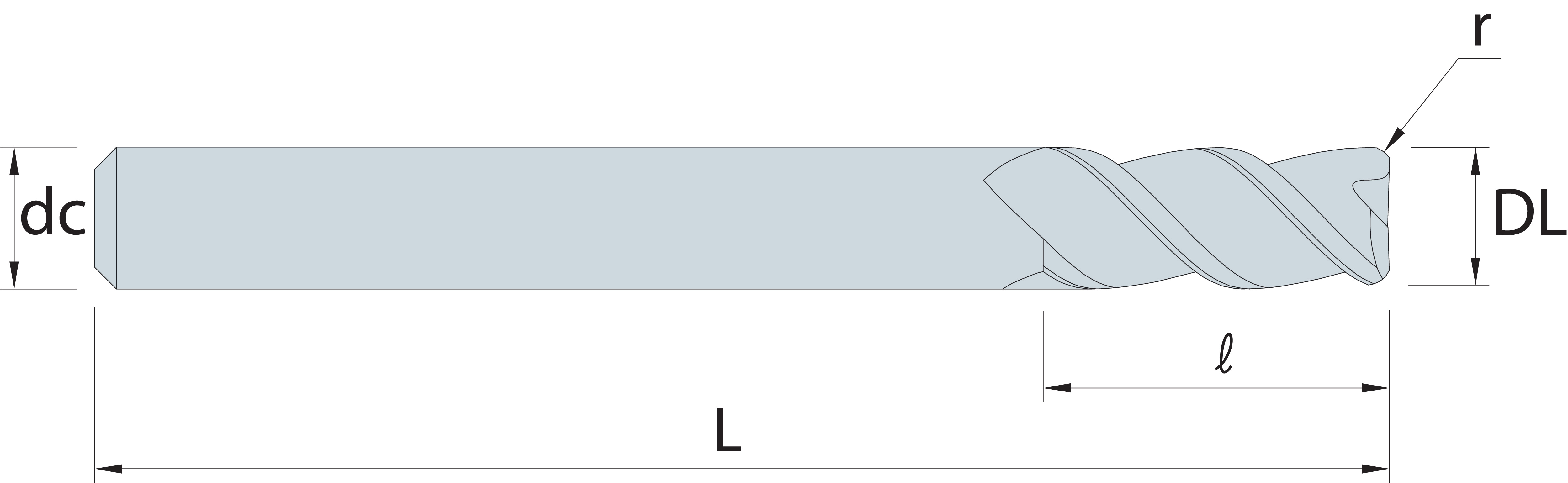 Codice | Descrizione | Diametro Lavoro (DL) | Numero Taglienti (Z) | Diametro Attacco (dc) | HRc | Lunghezza Utile (l) | Lunghezza (L) | Lunghezza (L1) | Raggio | Disp. | |||||||||||||